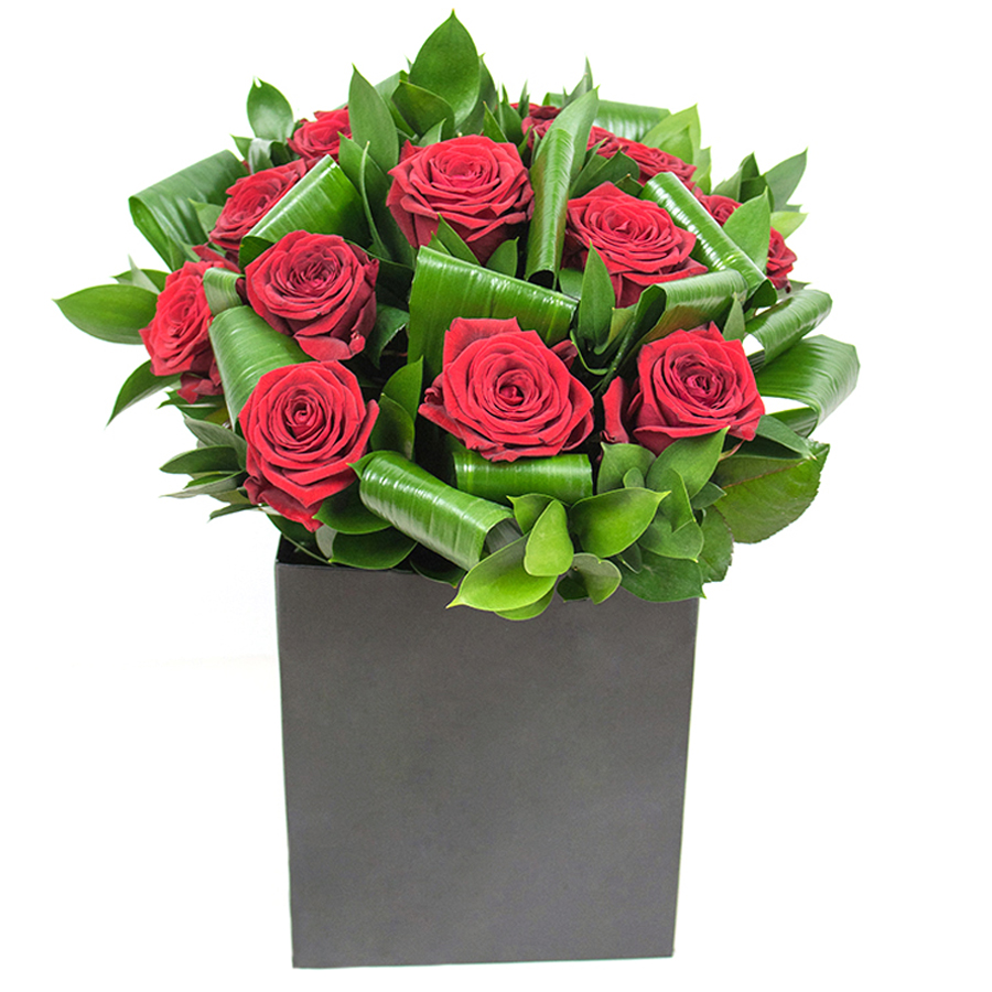 This stunning arrangement is an exquisite fusion of vibrant red roses and lush greenery, featuring aspidistra leaves and ruscus. Every element of this bouquet has been carefully curated to bring a touch of sophistication and warmth to your home. The rich red hues of the roses are beautifully contrasted with the delicate shades of green, creating an eye-catching design that is both chic and timeless.